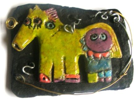 Xisto, arame, barro com mistura pintado a 1.020º C