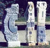 Três elementos escultóricos em mármores de várias cores