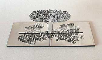 Nome - Município de Azambuja Dimensões s/base - Fechada, altura, 9cmx largura, 7cmx profundidade, 8cm. Aberta, altura, 6,5cmxlargura, 18 cmx profundidade, 7cm. Base, altura, 1cmx largura, 19cmx profundidade, 8cm.