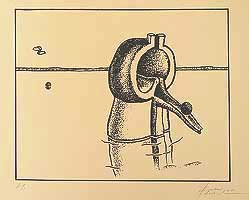 Nome – O cão do Minotauro!? Materiais – Papel de algodão. Técnica – Serigrafia à base de tintas de água a uma cor (preto). Ano – 1997.