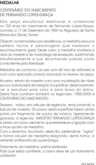 MEDALHA nome:CENTENÁRIO DO NASCIMENTO FERNANDO LOPES-GRAÇA tamanho: 80mm materiais: BRONZE técnica: CUNHADA ano:2006 edição: CASA DA MOEDA