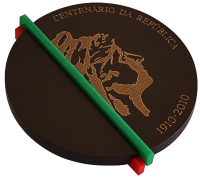 O outro elemento que contrasta com a monocromia das gravações no bronze, são as duas placas de acrílico em cor vermelha e verde, que se fundem tanto na imagem da República como no escudo português, numa simbiose de simplicidade e textura, cor e monocromatismo, recriando a representação do país pela Bandeira Nacional.
